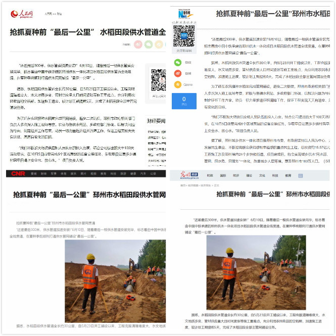 6月10日,由公司承建的邳州市供水一體化PPP項目水稻田段供水管道全線貫通。 邳州市供水一體化PPP項目水稻田段供水管道全長約30公里,自5月23日開始鋪設以來,項目部克服清障難度大、水文地質多變、管材供應量大且時間緊張等施工重難點,充分利用農民收蒜的空檔期,加速施工進度,1...